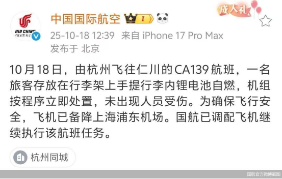 随即,中国国际航空官方微博对于整个事件情况做了陈述:由杭州飞往仁川的CA139航班,一名旅客存放在行李架上手提行李内锂电池自燃,机组按程序立即处置,未出现人员受伤。为确保飞行安全,飞机已备降上海浦东机场。国航已调配飞机继续执行该航班任务。